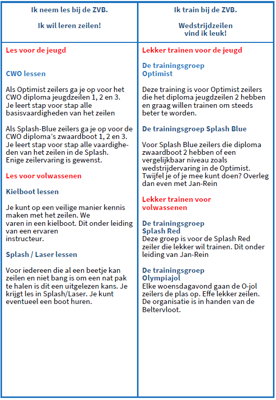 Voor vragen over de trainingen Splash Blue & Red en de Optimist mail je naar gniniart.[antispam].@zvbelterwiede.nl. Vermeld duidelijk je naam en telefoonnummer.